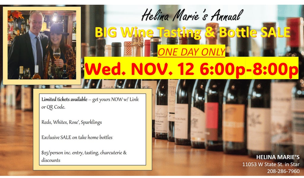 | Annual Wine Tasting and Bottle SALE on Wed. Nov. 12 6p-8p at Helina Marie’s.