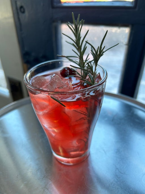 Using our made-from-scratch orange cranberry syrup as the base, we add a touch of elderberry and hibiscus and some grapefruit to sweeten the tartness of the cranberry and finish with a rosemary garnish. We then add some sparkling water to make it extra refreshing.