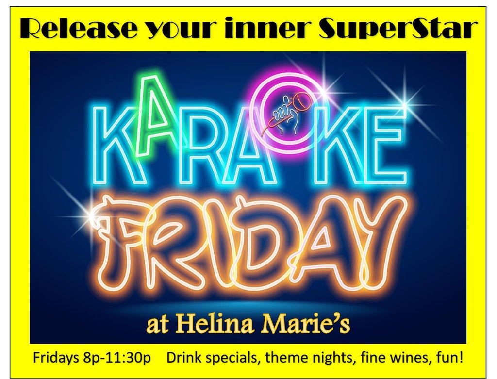 Ready to have some end of the week fun??? Bring friends to attend Karaoke Night at Helina Marie’s. Enjoy all kinds of beverages, drink specials, fine wines, beers and cocktails. Groups, duos, solos welcome to sing or just sit back, relax and enjoy the entertainment. Call to reserve table for groups of 6 or more 208-286-7960. Must be 21 w/ ID to attend. Great place for Karaoke beginners, as well as, accomplished singers.
