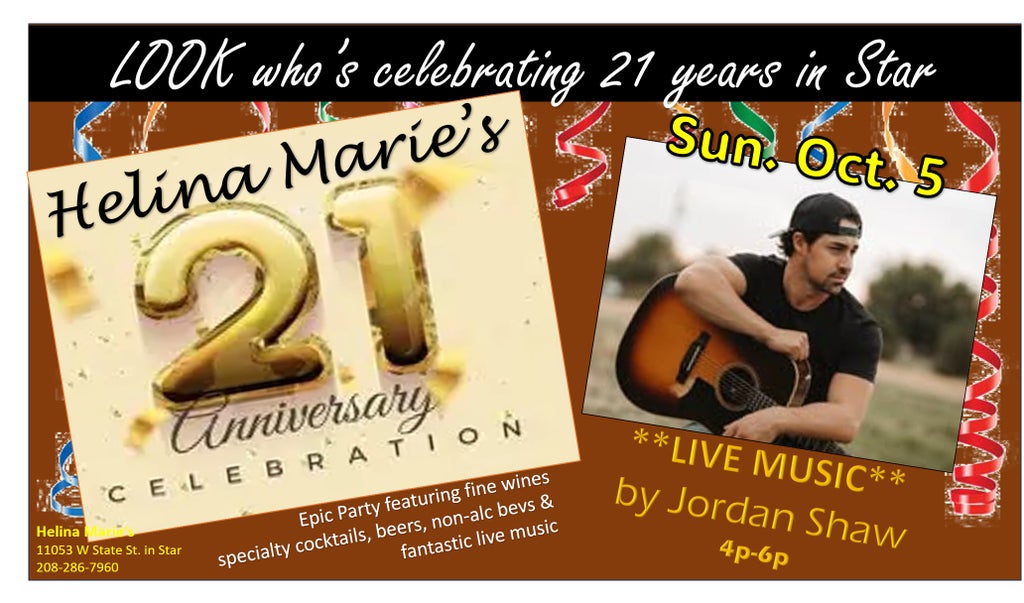Make plans to attend Helina Marie’s 21 Anniversary Celebration on Sunday, Oct. 5. Open 2p-7p with LIVE MUSIC 4p-6p by local artist, Jordan Shaw. We’ll be serving up very special cocktails, fine wines, beers, non-alc beverages, fun, entertainment and dancing.
