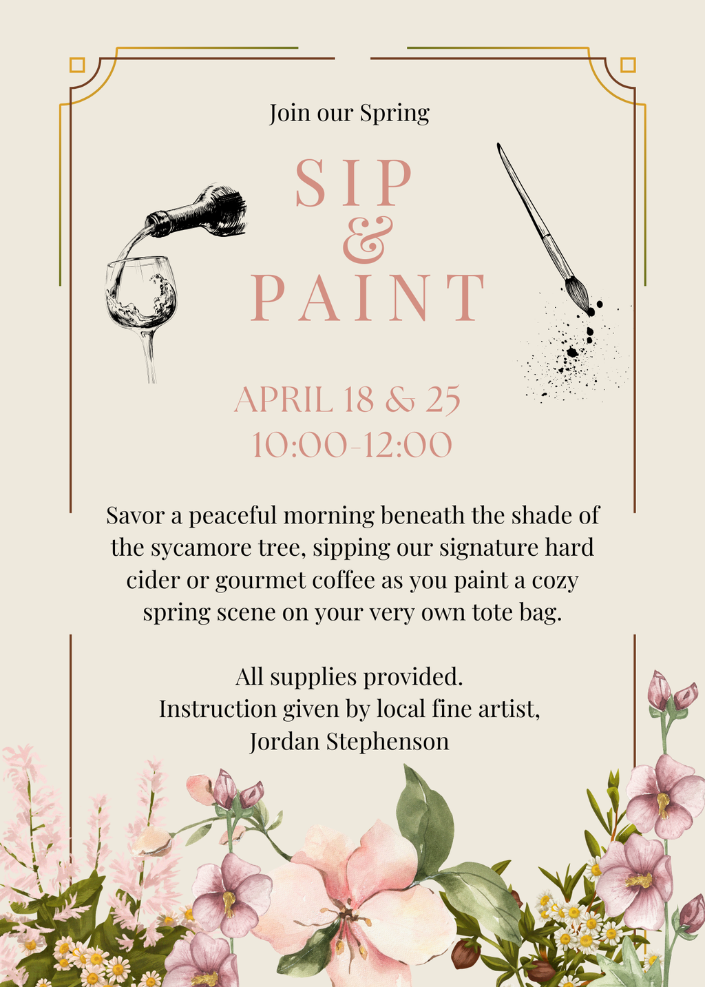 Join us for a relaxing Spring Sip & Paint morning at the coffee shop! We’ll be painting tote bags outdoors beneath the shade of our beautiful oak trees—a fun and creative way to enjoy a fresh country morning.