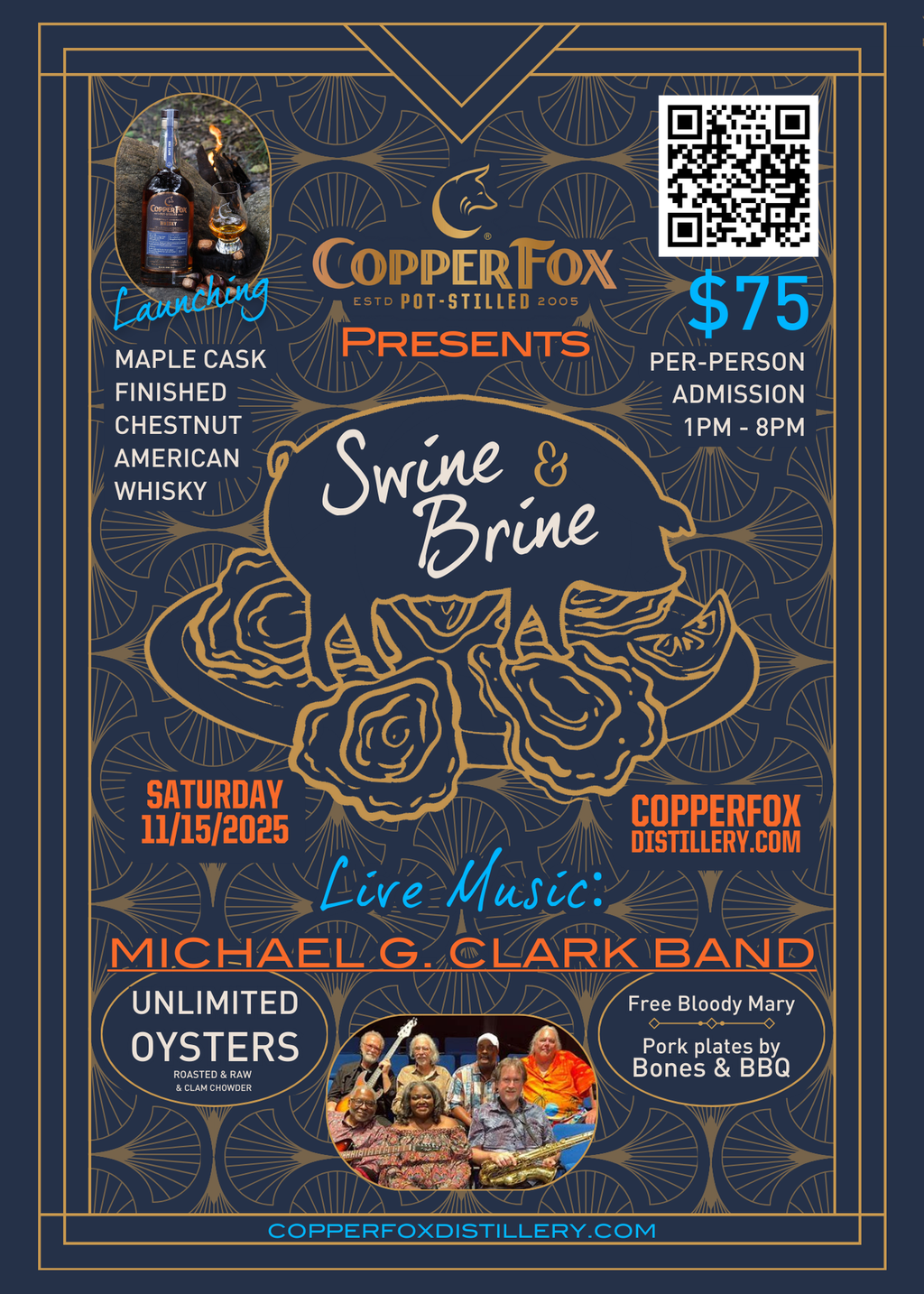 The Michael Clark Band has been in the music scene for over 30 years. The band plays a variety of styles, including Blues, Motown, Disco, Funk, Pop, Classic Rock, and Much More. We got to rock out with them during our last oyster roast, where they helped us launch our Dawson's Reserve Bourbon, and now we are stoked to have them play at the distillery again for our Swine & Brine! This event will launch our Maple Barrel Finished Chestnut American Whisky.