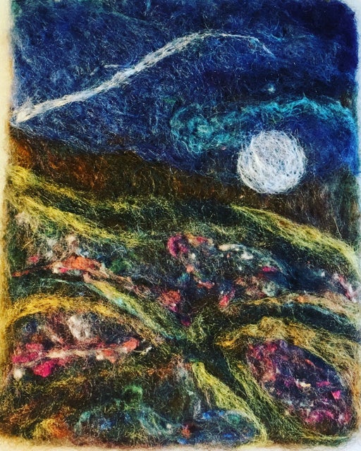 We’ll start with needle-felting your background, building color and textures for your specific design, and then we’ll finish it off with a steam wet-felt before matting and framing your work