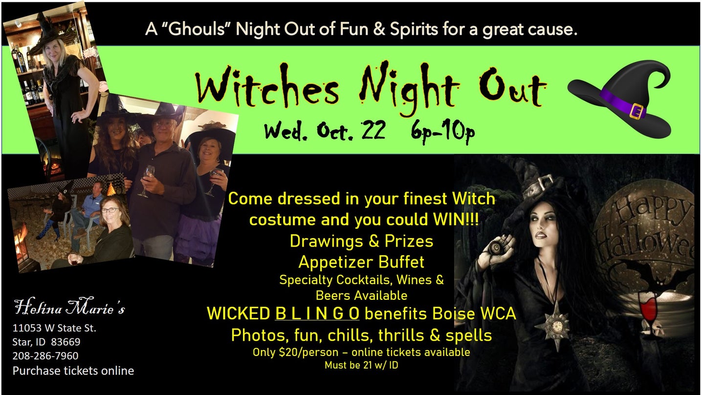 Invite all your “ghoul-friends” to attend Helina Marie’s Annual Witches Night Out on Wed., Oct. 22 6:00p-10p. Dress in your best wicked, ethereal or good witch costume - winners awarded prizes. Only $20/person gets you in, a BLINGO card, photo booth and appetizer buffet. Wines, specialty cocktails, beers, non-alc beverages and charcuterie available for purchase. All this fun for a good cause….a portion of our event sales benefits Boise Women & Children's Alliance to help with all the good they provide our communities. MUST PURCHASE RESERVATIONS IN ADVANCE by clicking online link. Limited seating and reservations. Must be 21 w/ ID to attend. Ample broom parking available.